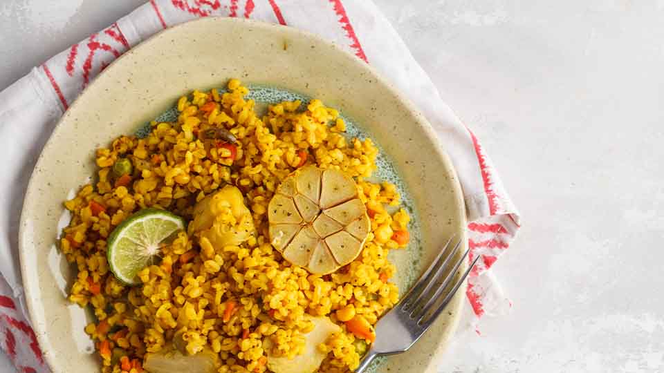 Den Couscous mit dem Ras el Hanout vermischen und mit ca.250 ml kochendem Wasser übergießen. Das Ganze dann 5-10 Minuten quellen lassen und mit einer Gabel auflockern.