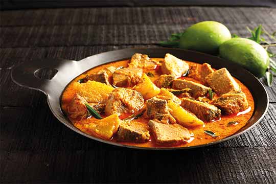 Mangofruchtfleisch und Fischfilets würfeln. Zu der Fischsauce den Blumenkohl und die Mangowürfeln geben und garen. Mit Koriander servieren.