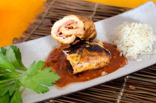 Gefüllte Geflügelroulade mit Reis auf Tomatensauce