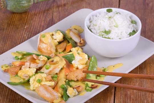 Hähnchen mit Reis, Bohnen und Erbsen