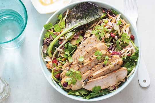 In einer Pfanne Olivenöl erhitzen, HÀhnchen von jeder Seite etwa 2 Minuten braten. Mit Salz und Pfeffer abschmecken.