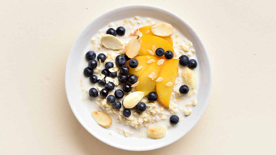 Den fertigen Haferbrei umrühren und mit den Mandeln, Blaubeeren und Pfirsich dekorieren.