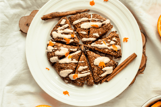 Backe den Teig auf einem Tortenboden oder einem tiefen Backblech für 25 Minuten bei 200°C. Schneide die Scones direkt nach dem backen in Rechtecke oder Kuchenstücke und lasse sie vollständig auskühlen.