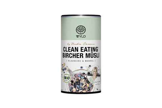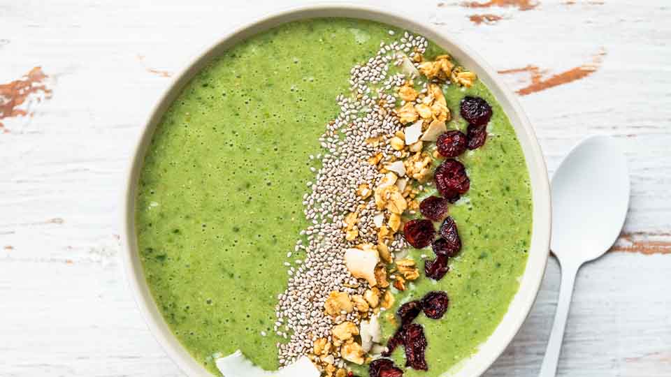 Smoothie Bowl mit Heidelbeeren, Banane, Kokosflocken und Müsli garnieren.