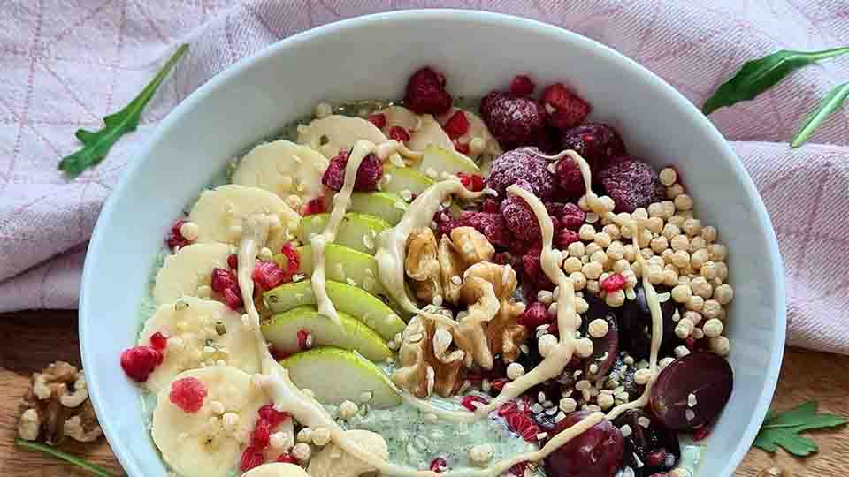 Die Bowl kann man noch mit Banane, Trauben, Himbeeren, Birne, Walnüssen, Cashewkernen abschmecken. Hanfsamen, Sojacrispies und Cashewmus getoppt werden.