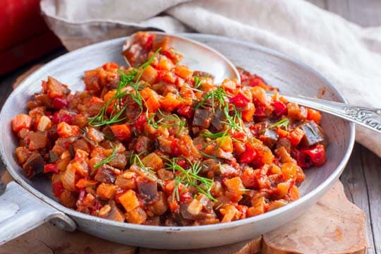 Süßkartoffeln mit Tomaten, Zwiebeln und Aubergine